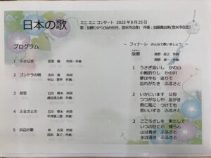 8月25日、加藤真由美様(登米市在住)と加藤ひかり様(登米市出身、仙台市在住)の母娘がデイサービスに来所され、『日本の歌ミニミニコンサート』を開催していただきました。