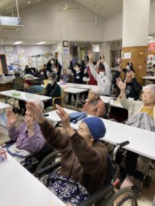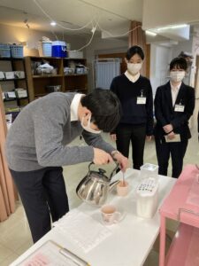 午後からは、体験学習として、特養利用者に提供するお茶にトロミ剤を調合して試飲を行うとともに、利用者との会話や機能訓練体操などを通して、交流を深めることができました。